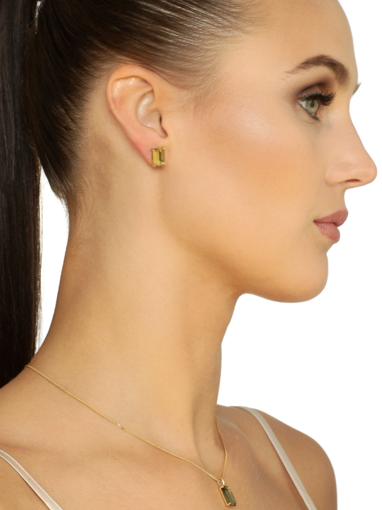 Våra klassiska studs örhängen i guld med en vacker baguetteslipad, brun sten. Örhänget finns i både silver och guld och består av pin och plopp i sterling silver med detaljer i mässing med guldplättering.