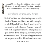 Till ditt köpta smycke medföljer alltid en designad smyckeask innehållande ett gåvobrev som beskriver personen och dess personlighet utefter vald färg på sten. Vill du ha en annan ask med ett annat citat? Vänligen notera detta i ordernoteringar när du lägger din order.