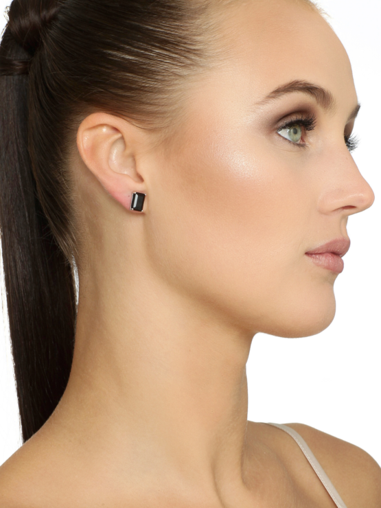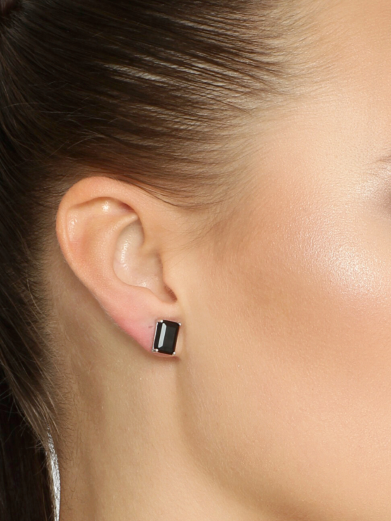 Vårt klassiska örhänge i silver med en vacker baguetteslipad, svart sten. Örhänget finns i både silver och guld och består av pin och plopp i sterling silver med detaljer i mässing med rhodiumplättering.